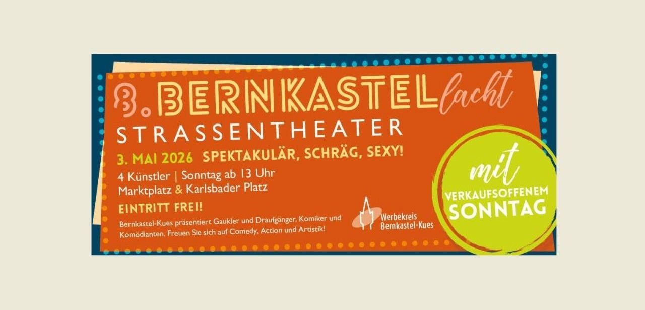 Am 3. Mai 2026 bietet der Werbekreis Bernkastel-Kues e.V. erstmals einen verkaufsoffenen Sonntag in Verbindung mit dem Straßentheater „Bernkastel lacht“. Ab 13 Uhr laden Geschäfte in der Altstadt zum entspannten Einkaufen ein, während Künstler die Gassen mit Comedy, Musik und Artistik beleben. Die Kombination aus Handelsständen, Bühnenprogrammen und kulturellen Darbietungen schafft eine attraktive Atmosphäre, in der Besucher Schnäppchen entdecken, lokale Produkte erleben und gemeinsam unterhaltsame Stunden verbringen im historischen Zentrum.